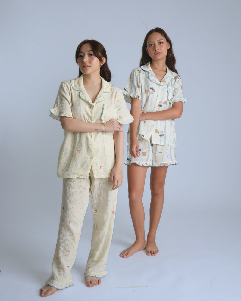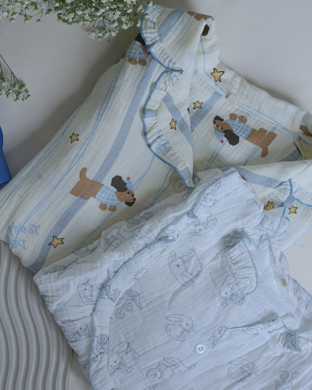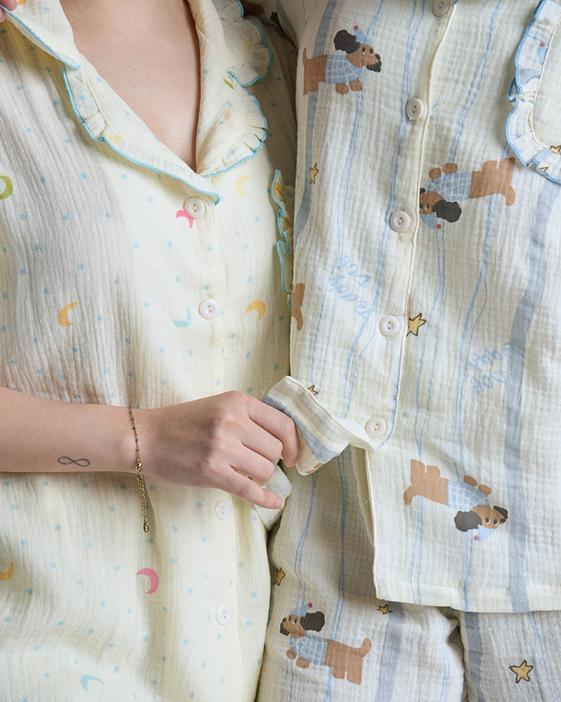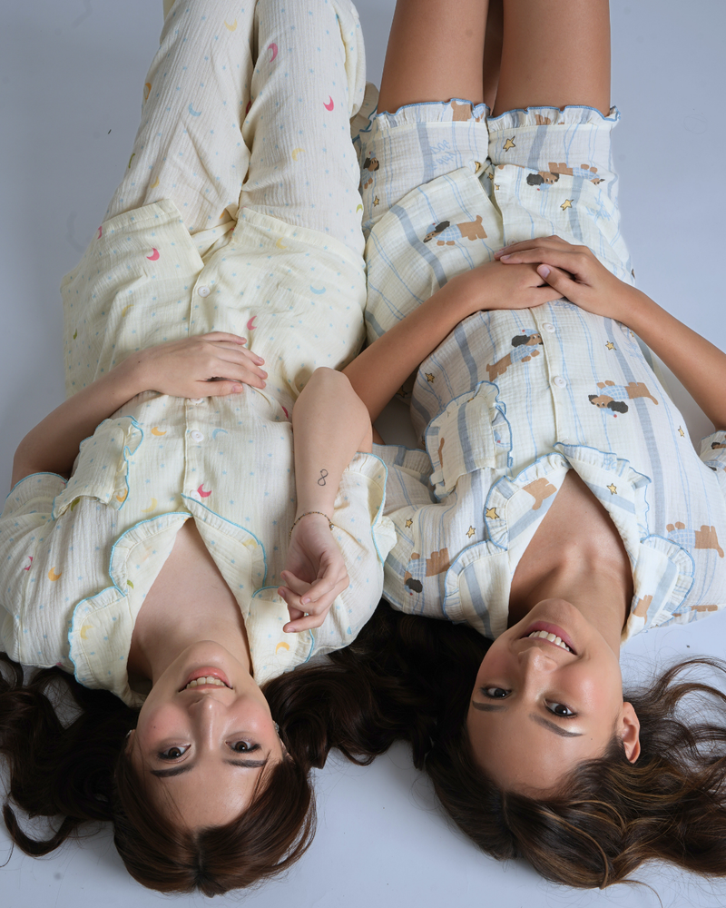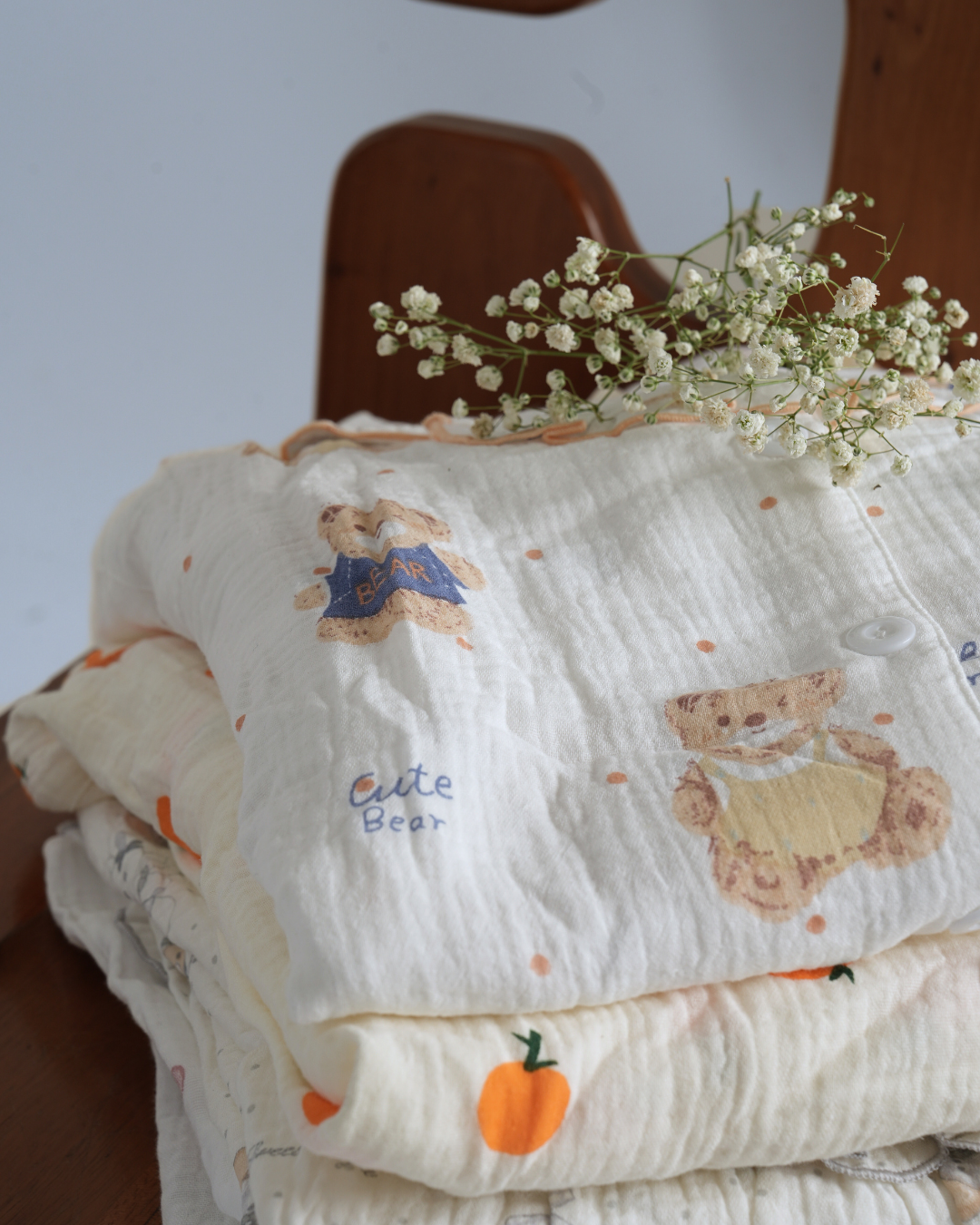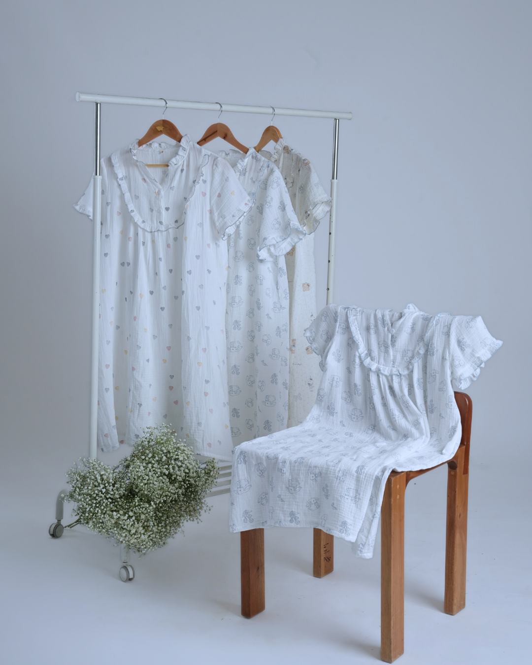Layers of muslin cotton made to embrace you with warmth and ease. The gentle texture and cozy prints bring a quiet calm to your mornings and a familiar softness to your nights. Each piece is thoughtfully made to feel good, look charming, and last through everyday comfort.